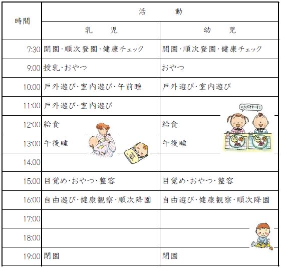 ②開園時間 7:30~19:30 延長保育時間 18:00~19:00 (土曜のみ18:30まで)